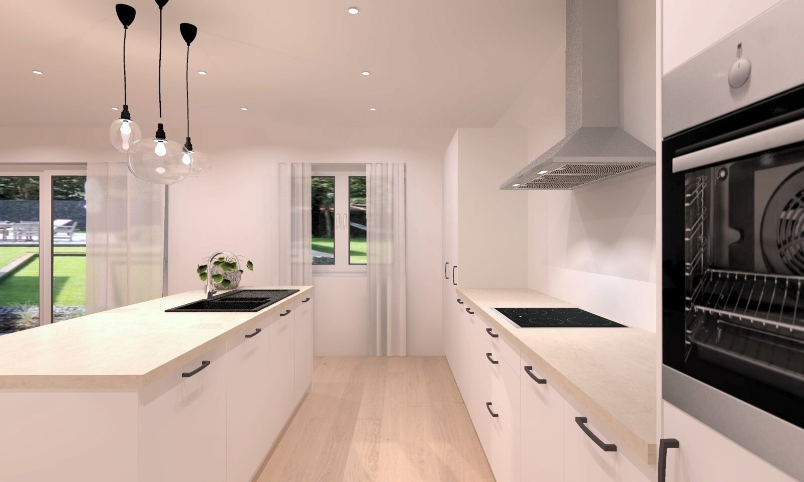 Zo wordt elke woning uitgerust met vloerverwarming via een warmtepomp (passieve koeling ook mogelijk), zonnepanelen, ventilatiesysteem D en regenwaterrecuperatie.